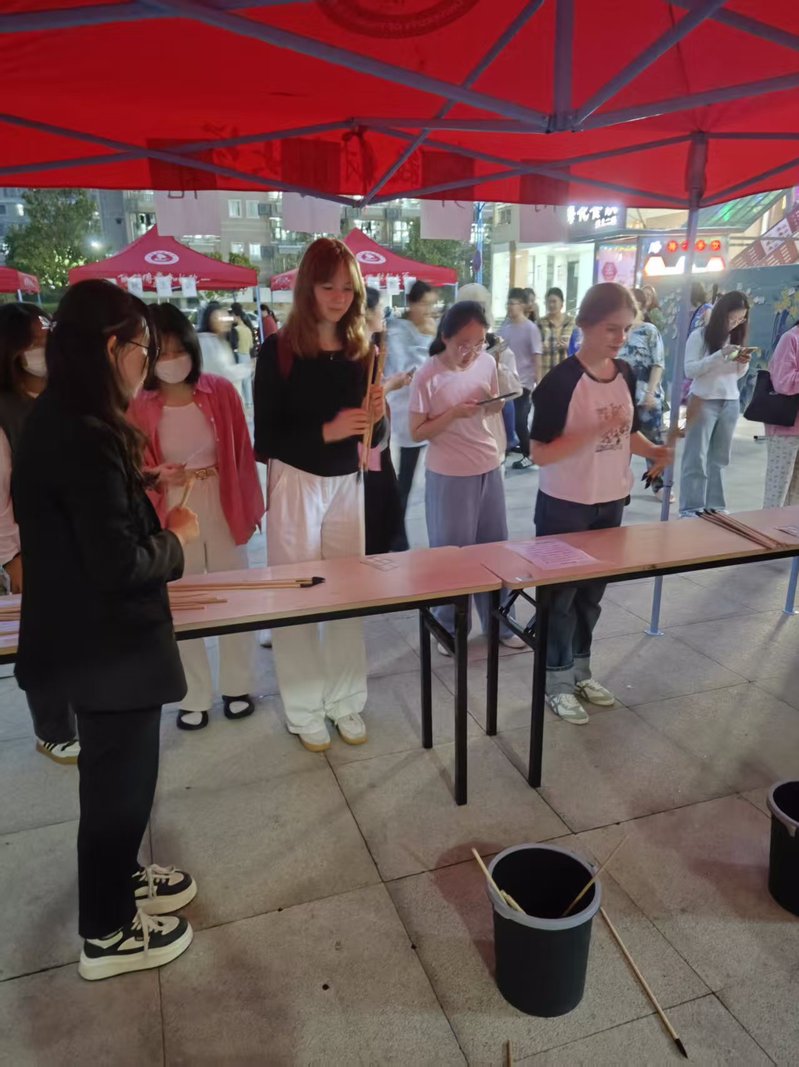 活动现场处处洋溢着浓郁的节日氛围,特色游戏区前早早排起了长队,成为中外学子互动的“欢乐据点”。“成语雅集”区里,中外学子围坐一堂,在汉字的海洋中探索智慧与典故,在文字游戏中触摸中华文化的韵律;“博弈射礼”区,留学生在指导下学习投壶技巧,体验古人“射以观德”的雅致。“月圆叠彩”“秋韵球舞”“中秋密语”等游戏区同样热闹非凡,或默契配合传递彩球,或共同拆解趣味谜语,或手写中秋祝福卡片互赠。学子们不仅收获了欢乐,还赢得了各式精美的中秋主题奖品,现场欢声笑语,成为校园里最温暖的旋律。