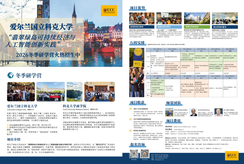 爱尔兰国立科克大学2026年寒假研学项目(1月24日至2月4日)正在火热招生中。